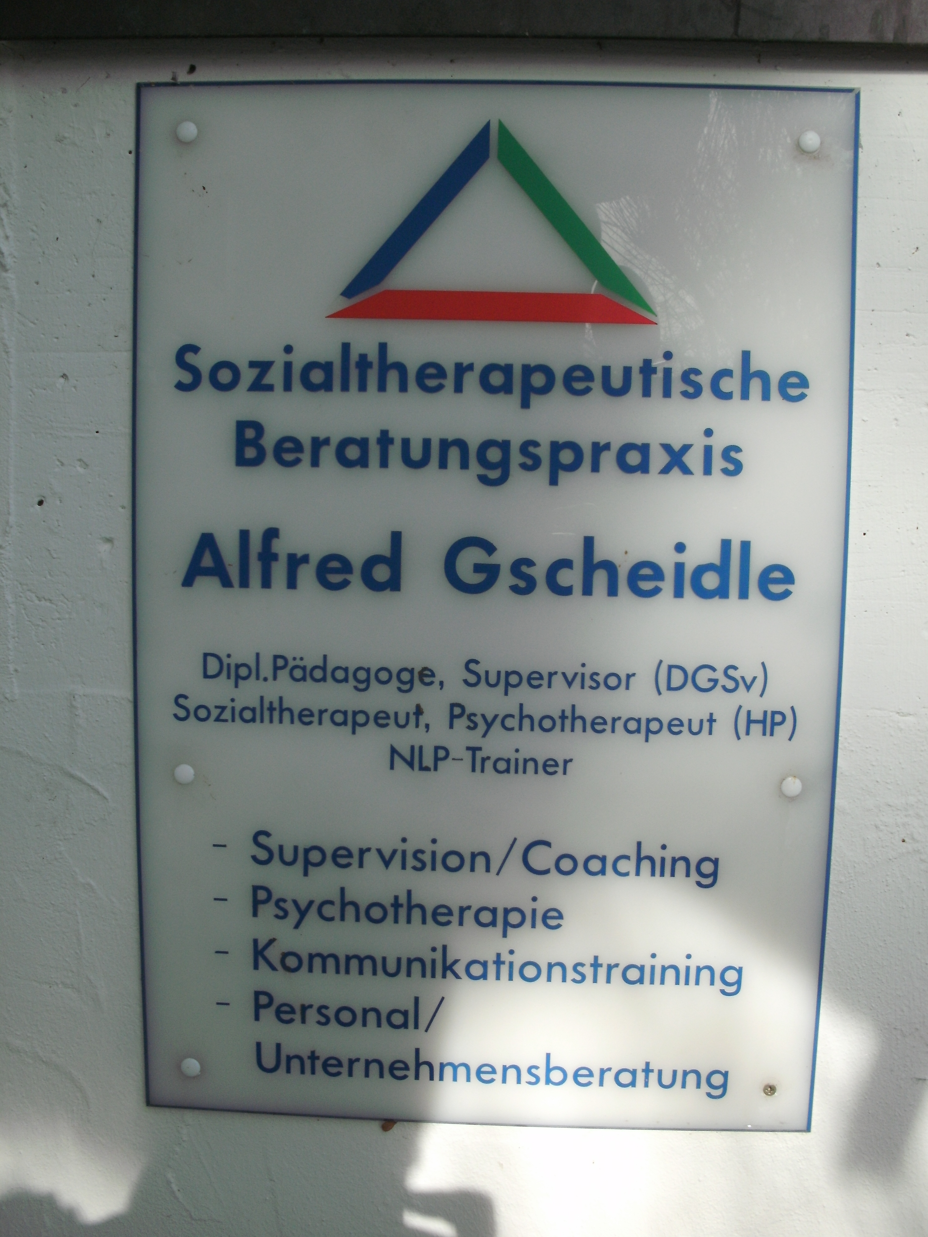 Sozialtherapeutische BeratungspraxisAlfred Gscheidle Schlierbacherstr. 39, 73230 Kirchheim unter TeckTel.: + 49 (0) 70 21 - 7366590 (geschäftl.) - 736288 (privat);Fax: + 49 (0) 70 21 - 7366591E-Mail: info@alfred-gscheidle.de